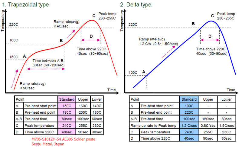 預熱區:預熱通常是指將溫度從常溫升高到150℃和從150℃升高到180℃。從正常到150℃的溫度升高小于5℃/秒(在1.5℃?3℃ °C /秒),150℃至180℃之間的時間約為60?220秒。 緩慢加熱的好處是讓糊狀蒸氣中的溶劑和水按時出來。 它還可以讓大型組件與其他小型組件一起加熱。